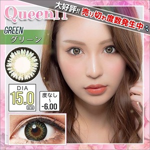 『Queen11』グリーンは、キツくなり過ぎない、甘い色合いのグリーンが着色で3トーンカラーだよ。瞳への馴染みも発色も、とても綺麗でやり過ぎ感やケバさが無いから、グリーンカラコンが好きな人も、グリーンカラコン初心者さんも、誰でも使いやすいのだ。『Queen11』グリーンは、つけ心地の良さも評判で、すっぴんでは浮いてしまうけれど、濃いめメイクでも薄めメイクでも、相性抜群!特にしっかりメイクと合わせると、瞳をぱっちり愛らしくなるので、お人形さんのような目元になれちゃうの。あまりバサバサしていない、薄めのつけまを合わせても、クールなリアルハーフっぽくなりたい子におすすめ。また、今流行りの黒髪と合わせるてもOK!『Queen11』グリーンは、とっても可愛らしく似合うので、清楚系ファッションと合わせるても◎暗めの場所では、少々グレーっぽい発色になるけれど、高発色で使いやすいおすすめカラーだよ。